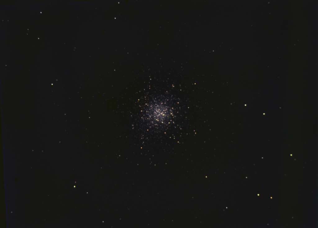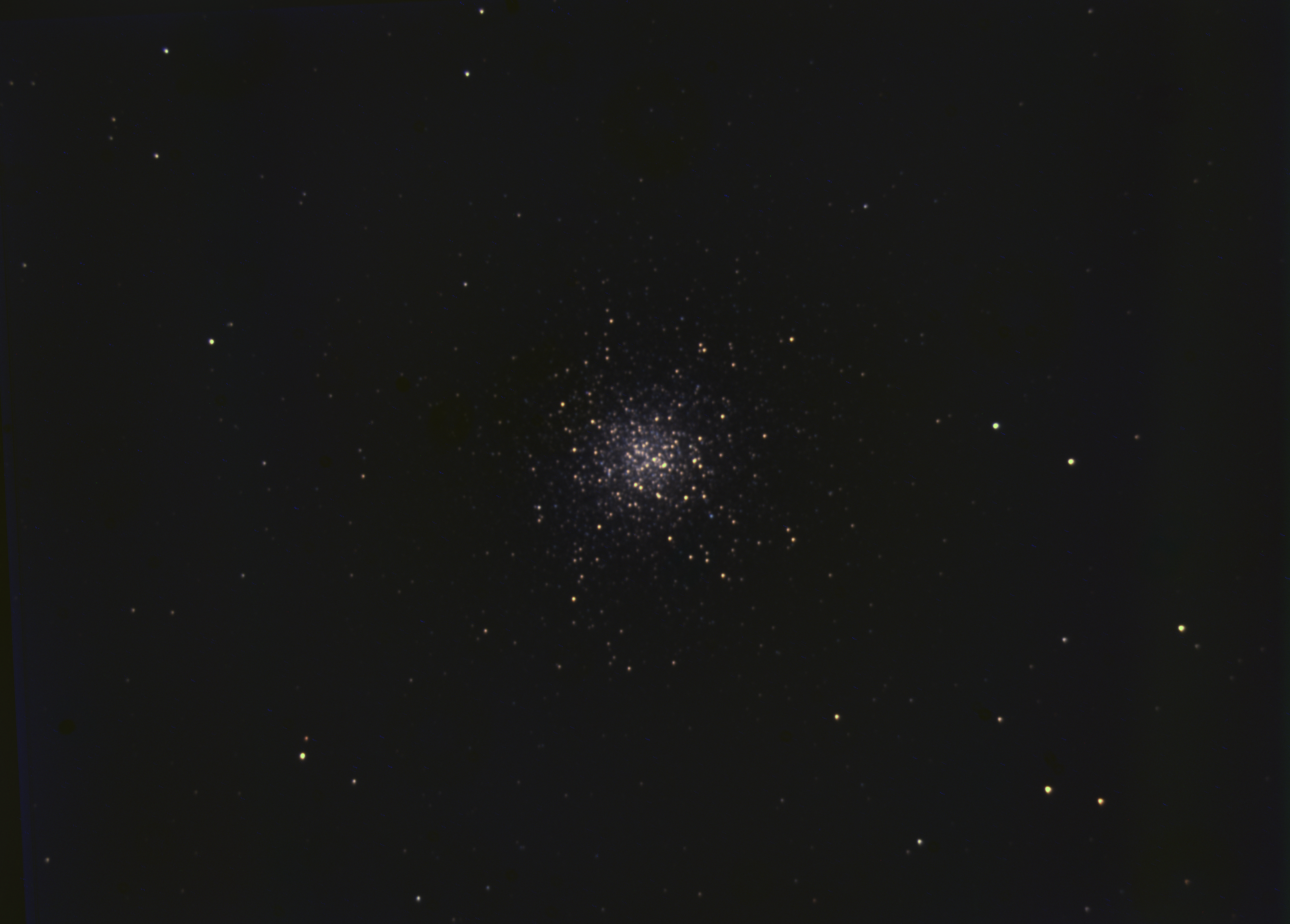 Innerhalb einer gedachten Kugel von nur 125 LJ Durchmesser drängen sich die Sterne und werden durch ihre gegenseitige Anziehung zusammen gehalten. Dabei müssen sich die Sterne wie ein wilder Bienenschwarm durcheinander bewegen – sie pendeln quasi durch den Haufen ohne dabei mit anderen Sternen zu stossen. Die Milchstrasse besitzt etwa 160 Kugelsternhaufen. Mit hochaufgelösten Aufnahmen der Kugelhaufen wird nach ev. im Zentrum vorhandenen Schwarzen Löchern gesucht. In M13 könnte sich eines mit maximal 13’000 Sonnenmassen verbergen. Die Aufnahme entstand mit einer AST8300 Kamera durch ein C8 Teleskop in Zürich-Affoltern.